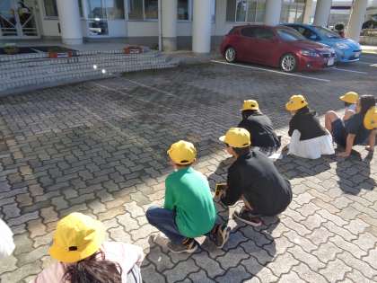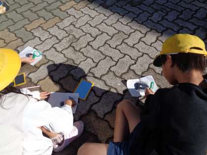 今日はまず、鏡で反射した日光がどのように反射して進むのかを確認しました。影にできた光の道筋から、「真っ直ぐに進んでいる」ということに気付いていました。
