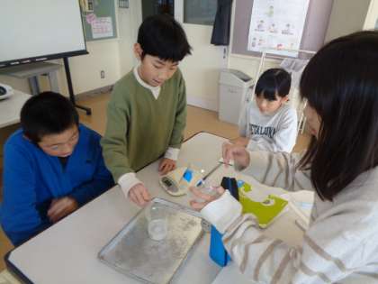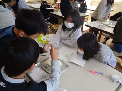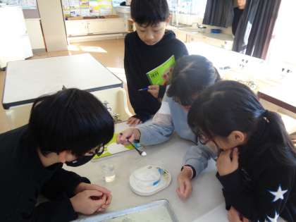 理科では、物のとけ方についての学習に入りました。まず、くらしの中で料理やお風呂場など様々な物がとける場面を思い浮かべ、とけた物のゆくえを考えました。予想したことを確かめるために正しく実験することができました。グループで協力して取り組む姿がすてきでした。