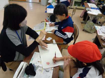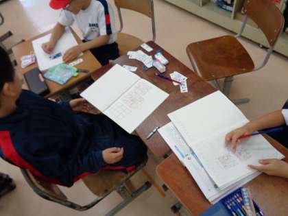 今日の算数は、九九ビンゴを行いました。9マスに各だんの答えを好きなように入れて、友達と九九カードをめくって色を塗りました。九九の答えを確かめながらビンゴを楽しんでいました。