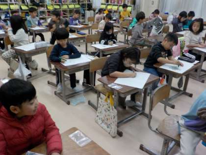 今日は1年生に新しい硬筆墨を配りました。まだ先が細いので、先を丸くして太い線を書けるようにしました。