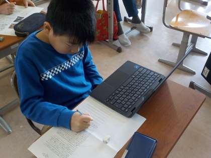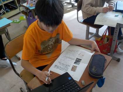 4年生は国語科で、自分で選んだ伝統工芸品のよさを伝えるリーフレットづくりに取り組んでいます。今日は表紙作りや説明書き等に取り組みました。