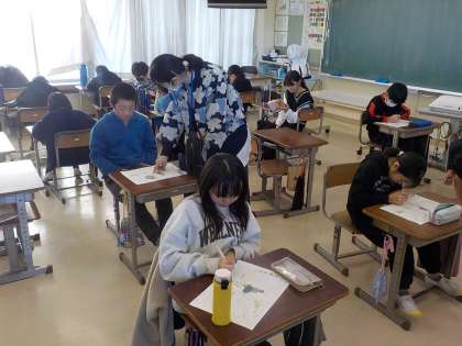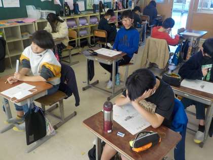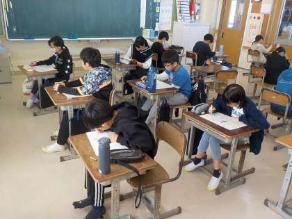 5年生は社会科で、学習のたしかめテストを行いました。子供たちは資料を丁寧に読み取って問題を解いていました。