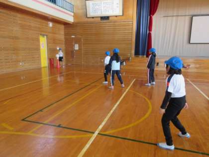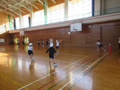 柔らかいボールを手で打って、コーンにタッチすれば得点です。ボールを中心に手を繋いで「アウト」と叫べばアウトが取れます。守るときは初めから手を繋ぐ作戦や攻撃では遠くへボールを飛ばす作戦を立てて、チームワークの良さで勝負します。最終バッターで大逆転!大盛り上がりしました。