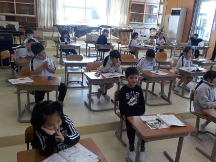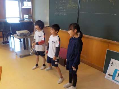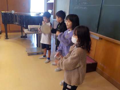 1年生は音楽で、グループ毎に歌に合わせてトライアングルやカスタネットを鳴らす演奏を聞き合いました。