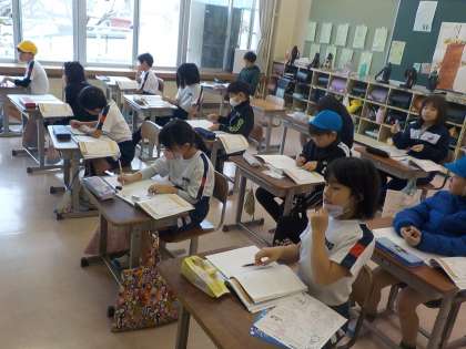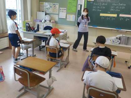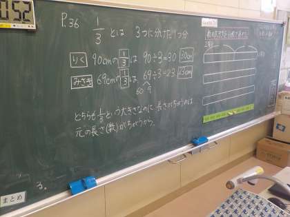 3年生は算数で、1という大きさを等分した分数について学習しました。子供たちは数直線を等分しながら考えました。