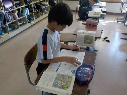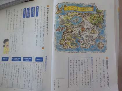 3年生は国語科で、宝島の地図を手がかりに冒険のお話作りを行いました。子供たちは、登場人物や出来事などを思い巡らせながら書き進めていました。