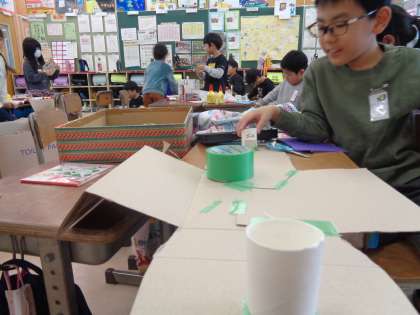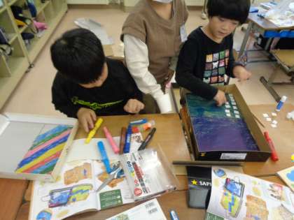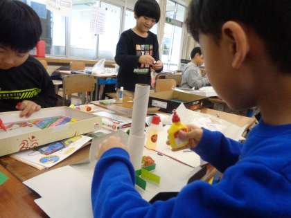 今日の図工は、空き箱を使って、すごろくを作り始めました。どんな世界にするか考え、折り紙でマス目を作ったり、紙コップでスタートを作ったりしました。完成が楽しみです。