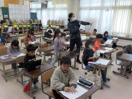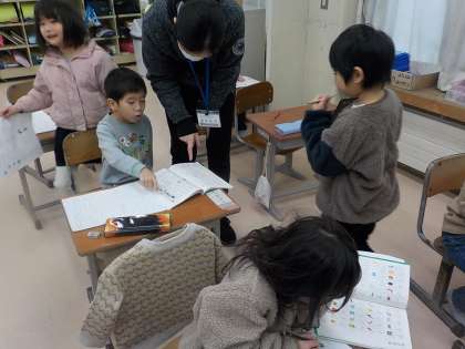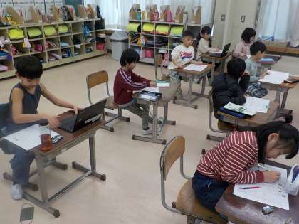 1年生は国語の復習プリントに取り組みました。覚えていないカタカナがあると、教科書で調べながら書き込みました。