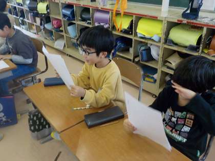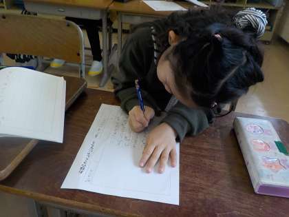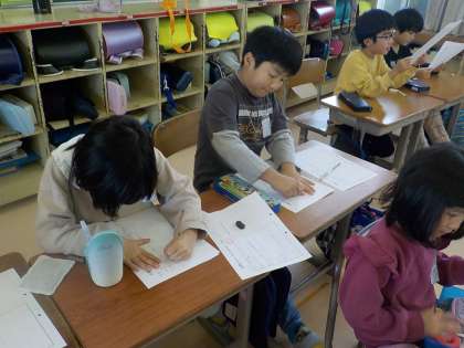 2年生は国語科で、お話づくりに取り組みました。子供たちは、登場人物や簡単なあらすじをメモに書いたあと、それを参考にお話を書いていました。