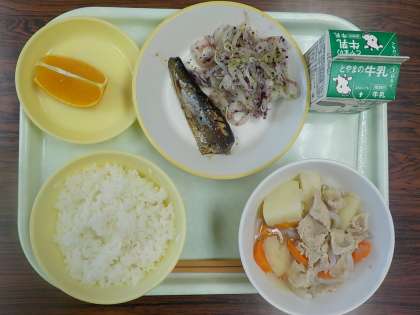 今日の給食メニューは ごはん いわしの土佐煮、ゆかり和え 塩肉じゃが あいか(みかん) です。