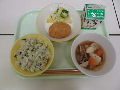 冬至に【ん】が付く食べ物を食べると運が付く(運が良くなる)といわれています。今日の根菜汁には、にんじん、れんこん、大根、こんにゃくといった【ん】が付く食べ物がたくさん入っています。かぼちゃは、なんきんとも呼ばれ、かぼちゃもまた、冬至に食べると良いとされています。今日はかぼちゃはコロッケにしてみました。