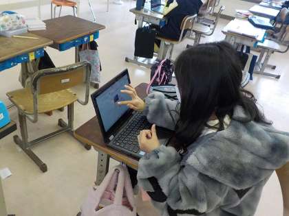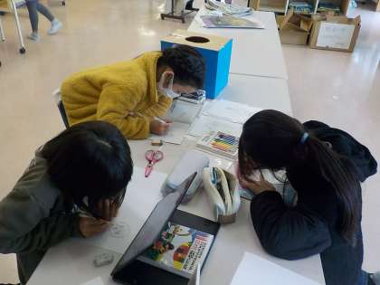 4年生は学級活動の時間にクラス集会の準備を行いました。端末を利用して参考となるイラストを見付けて、熱心に絵描いていました。