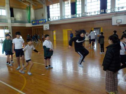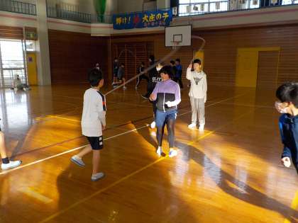 6年生は体育で、大縄の8の字ジャンプに取り組みました。時間内に何回跳べるかを計測しながら行いました。