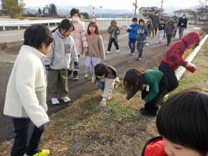 秋にはたくさんのはっぱが付いていた木が枝だけになっていたり、道端に生えている草に霜が付いて凍っていたりするのを見付けることができました。