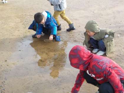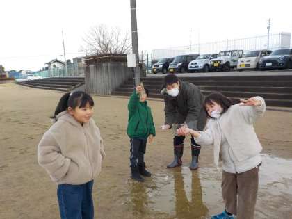 また、グラウンドに行くと、水たまりに氷が張っていました。
