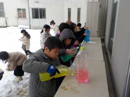 その後、色水をカップに入れ、氷ができそうな場所に置きました。