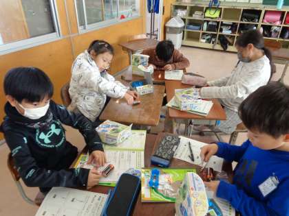 今日は、豆電球と乾電池をどのようにつなぐと明かりがつくのか、について実験しました。どう線をクロスしてもついたよ、横の銀色のところからずれるとつかなかった、など、色々なつなぎ方をためしてみて、楽しそうに実験をしていました。