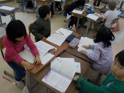 2年生は算数科で、10000より大きな数の学習をしました。今日は教科書の問題を自由進度で進めていました。やり終えた問題を○付けしたり、よく分からない問題を先生や友達に聞いて解決したりしました。分からないときは、そのままにせずしっかりと立ち止まってできるようにしましょう。