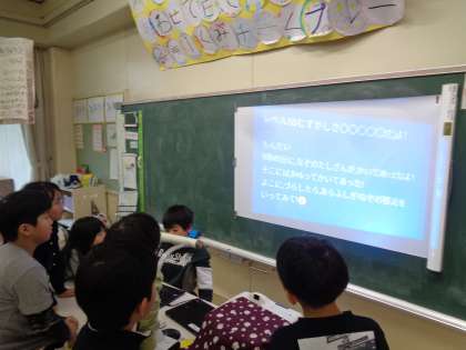 今日のわくわくタイムに、クイズ係によるクイズの発表がありました。スライドで一生懸命作った問題を見て、子供たちは楽しそうに答えていました。