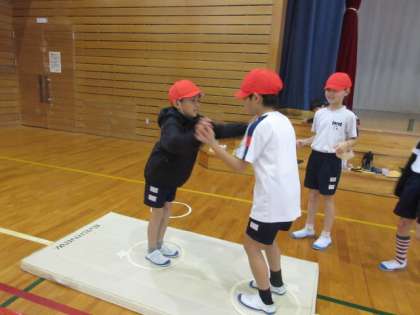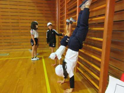 自分たちで考えた動きでサーキットトレーニングをやりました。「バランス」「力だめし」「用具を使って」「移動する」「組み合わせ」の5つの動きを各場所でやります。チームで協力して、新しい動きをやってみるなど工夫して動いていました。