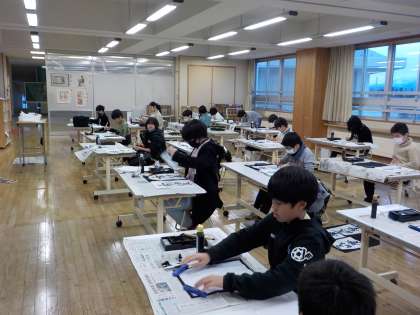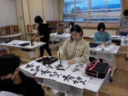 習字で「希望」と書き手います。書き順や字のバランスに気を付けて集中して書いています。