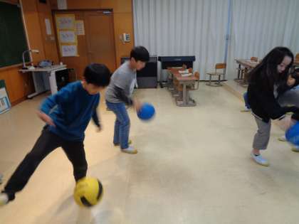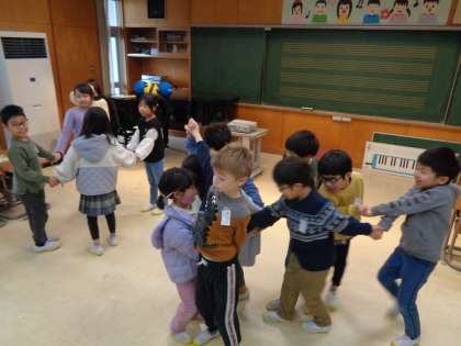 今日の音楽は、日本の音楽に合わせて体を動かしました。歌の中で「さ」が出てきたときにボールをまたいだり、歌に合わせて手をつないだまま反対を向いたりなどしました。子供たちは楽しそうに友達と体を動かしていました。