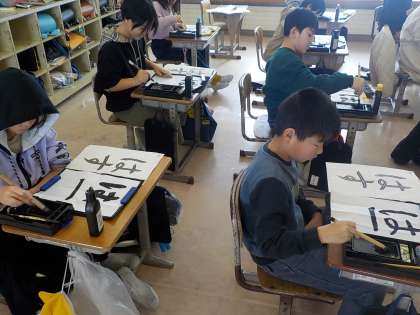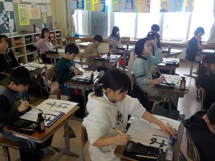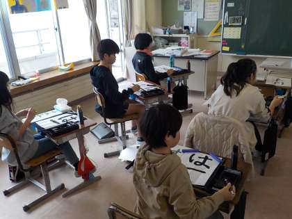 4年生は書写の時間に、題字「はす」を揮毫しました。子供たちは墨の付け方に気を付けて一画一画丁寧に書いていました。