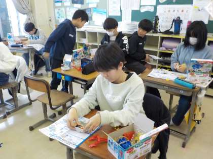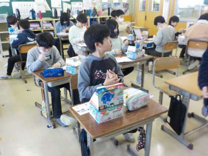 理科です。「電流がうみだすちから」の学習で電磁石の学習をしています。今日は、コイルに鉄心を通して電流を流し、クリップがくっつくかなどの実験をしました。自分でじっくり取り組むもよし、友達に教えてもらいながら進めるもよしです。