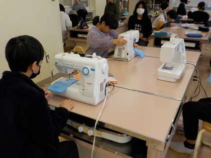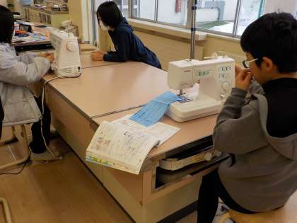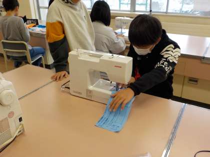 家庭科では、ミシンでの作品作りに取り組んでいます。まずは練習です。しっかりと手順を覚え、安全に気を付けて練習していきます。