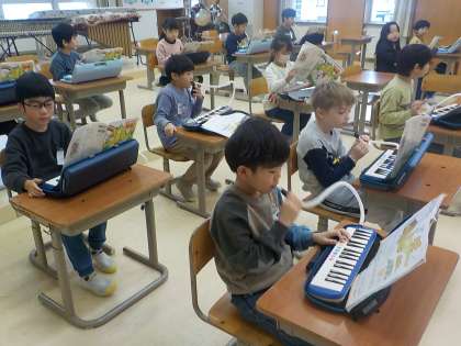 2年生は、歌声と鍵盤ハーモニカの音の重なりを感じながら表現活動に取り組みました。