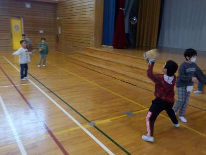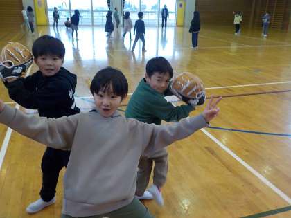 今日の中休みは低学年が体育館使用日でした。1年生の野球好きな子供たちが大谷グローブでキャッチボールをしていました。