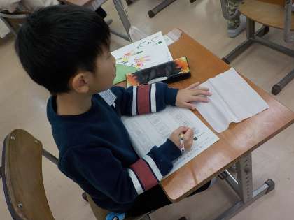 1年生は書写の時間に、形がよく似た漢字を集めて仲間分けをしました。そして、四角の形、縦に長い形、横に長い形等の特徴に合わせて書き取りをしました。