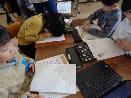 算数では、自由進度学習を取り入れています。「図をつかって考えよう」の学習では、グループごとに学習計画を立てました。自分たちで無理なく進められるように考えることが大切です。