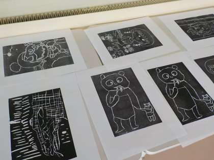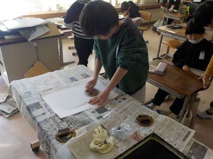 版画板にインクをつけて刷り上げます。彫りの仕上がり具合がわかるドキドキの時間です。