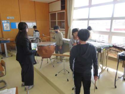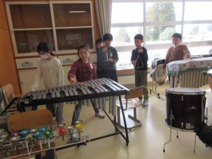 歌と歌の間に入れる「魔法の音楽」を作っています。太鼓や鉄琴、トライアングル、マラカス等を組み合わせて、グループで演奏して金曜日に発表です。今日は、歌と朗読と魔法の音楽を通せるように練習を頑張りました。