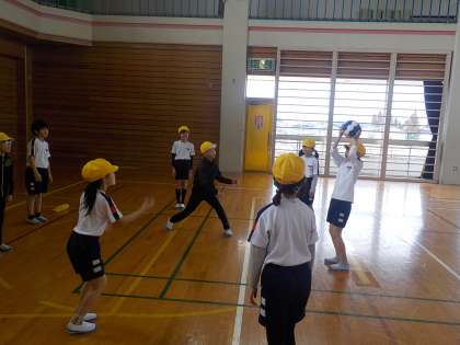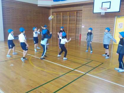 3年生は体育で、ボール運動に取り組みました。相手に取られないようにボールをパスしてつなぐ練習をしました。