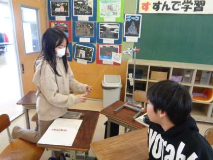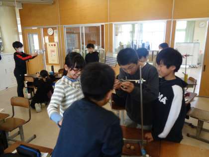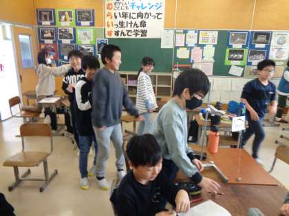 理科では、ふりこの学習に入りました。今日は、いろいろなテンポの曲に合わせてふりこを動かしました。「ひもの長さで調整したよ。」「おもりの重さも変えてみたよ。」と、工夫しながら音楽に合うように調整していました。これからふりこのきまりについて、予想をもとに実験で確かめていきましょう。