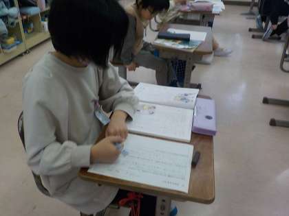 道徳科の授業の様子です。ワークシートに登場人物の思いを自分の考えと重ねて書いている様子がうかがえました。