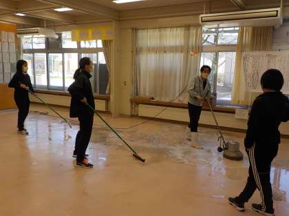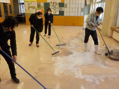 学習参観日の午後から、職員で教室のワックスがけの作業を行いました。洗剤で床の汚れをおとしてから、ワックスを二度塗りしました。