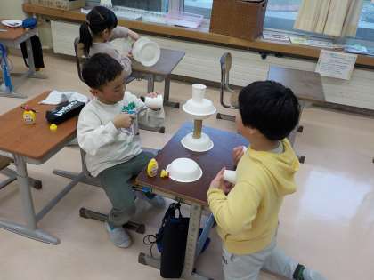 1年生は図工科で、コロコロ転がる作品づくりを進めました。どのように転がるか確かめながら取り組んでいます。