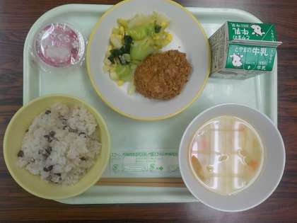 今日の給食メニューは 赤飯 とんかつ コーン和え みそ汁 さくらゼリー です。