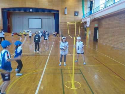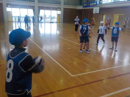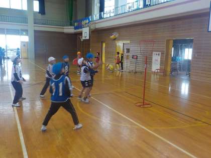 3年生は体育で、セストボールのゲームを行いました。リングに入るシュートの技能を高めている様子がうかがえました。