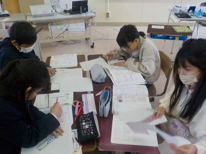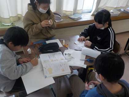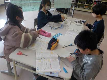 4年生は算数科の「箱の形のとくちょうを調べよう」の単元内自由進度学習に取り組みました。サイコロの展開図をかいて、切り取ったあとに、組み立てる作業をしている子供たちがいました。
