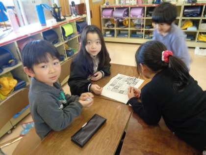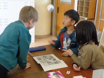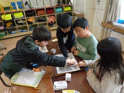 算数の学習で作った立方体をサイコロにしてすごろく遊びを行いました。子供たちはグループの友達と仲良く楽しんでいました。