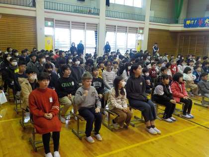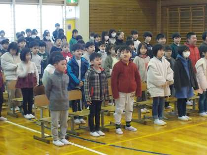 1〜5年生は、お祝いの気持ちを歌やよびかけの言葉で表現しました。
