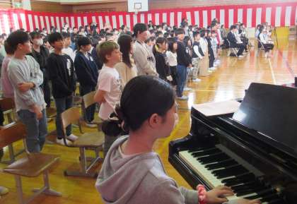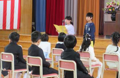 児童を代表して6年生の2名が、1年生に歓迎の言葉を伝えました。そして、歓迎の歌「世界中のこどもたちが」を2年生〜6年生で合唱しました。