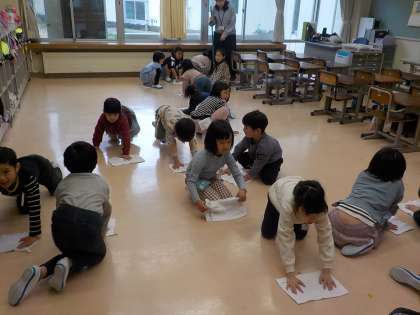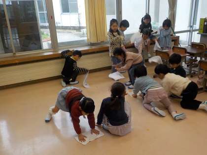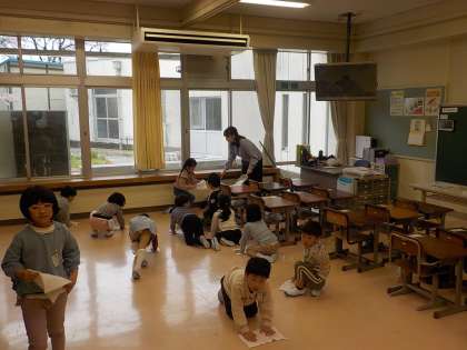 2組の子供たちも1組と同じようにそうじのやり方を学びました。ぞうきんがけをしてみると、たくさん埃が集まりました。