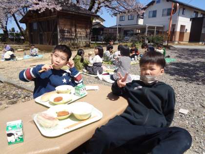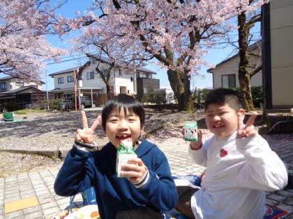 富山の桜が満開を迎えた日、よい天気に恵まれて「お花見給食」をしました。