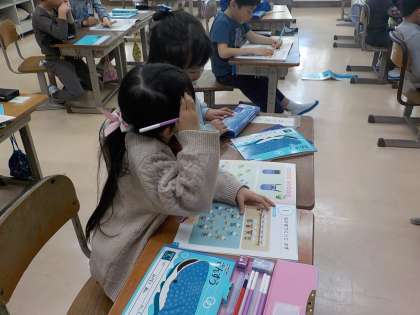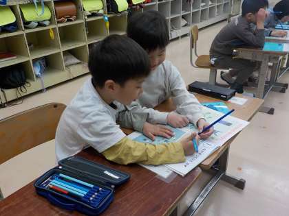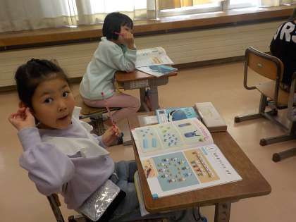 教科書の挿絵を見ながら、「どちらの動物が多いかな?」「どちらの花が多いかな?」という課題について、数えたり線で結んだりして考えました。