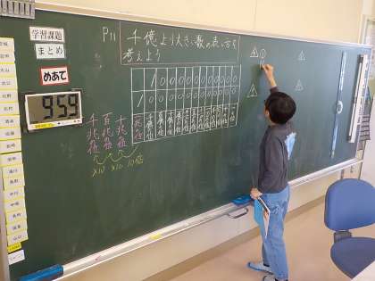 4年生は算数で、「1億より大きな数の仕組み」を学習しました。大きくなるにしたがって、万の位、億の位、兆の位と数が増えていくことを学びました。